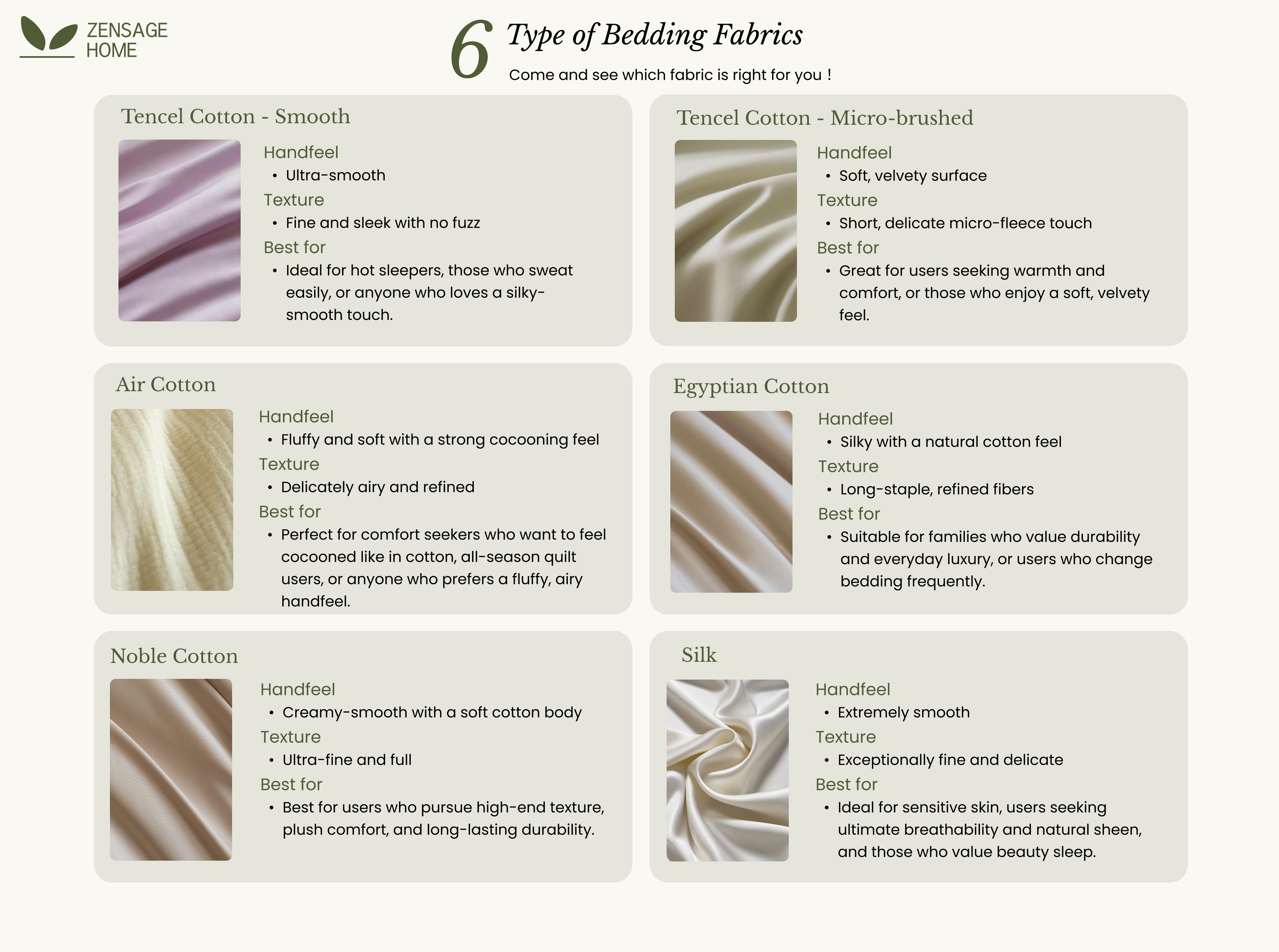 At Zensage Home, we offer five thoughtfully curated bedding fabrics, each designed for different sleep styles, climates, and aesthetic preferences. All are breathable, super soft, and made from 100% natural materials.